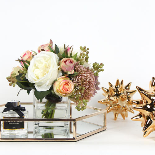 通過假水AB膠,可以將花固定在玻璃瓶?jī)?nèi)。假水AB膠凝固后,看起來就和真的水一樣在玻璃瓶里,花的造型也固定了。假水插花很適合酒店,餐桌裝飾。