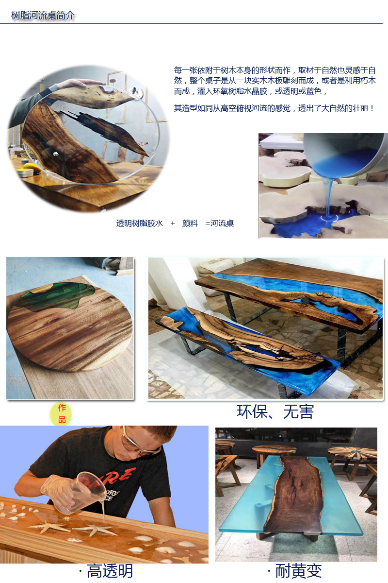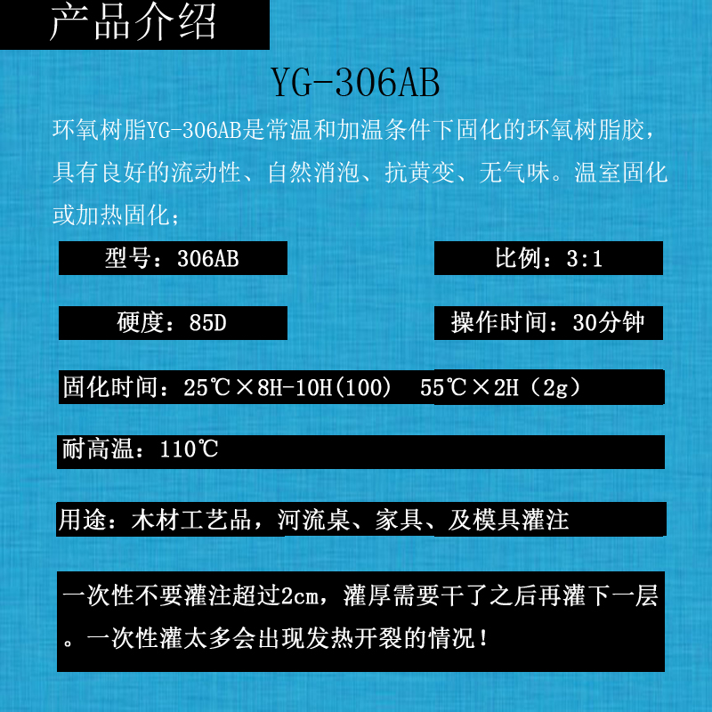 環(huán)氧樹脂YG-306AB是常溫和加溫條件下固化的環(huán)氧樹脂膠,良好的流動(dòng)性、自然消泡、抗黃變、無氣味。溫室固化或加熱固化;木材工藝品,河流桌灌注、家具、及模具灌注以及其它電子零件的絕緣、防潮灌封、保密遮封等。河流桌一次性不要灌注超過2cm,灌厚需要干了之后再灌下一層。